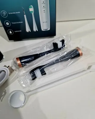 Aparelho elétrico para limpeza de dentes, com design moderno e acabamento preto. - Inclui ponta de limpeza. - Acompanha cabo de carregamento USB. - Possui 3 cabeças de escova extras. - Inclui espelho de inspeção dental.