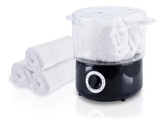 Secador de toalhas a vapor, ideal para uso em estética. Possui um design moderno em preto com um recipiente transparente. - Temporizador com marcações de 15, 30, 45 e 60 minutos. - Tampa transparente com alças laterais para fácil manuseio.