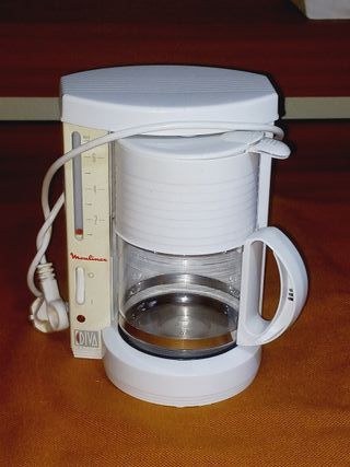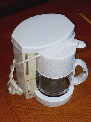Máquina de café de filtro Moulinex Diva. Conhecida como cafeteira de gotejamento. É um modelo vintage, popular no mercado de eletrodomésticos Capacidade: projetada para fazer cerca de 6 chávenas de café (indicador de nível de água visível na lateral). Potência: 1000 W. Material: Possui uma jarra de vidro e corpo de plástico branco e bege. Dimensões: 25 cm de altura e 500 ml de capacidade.