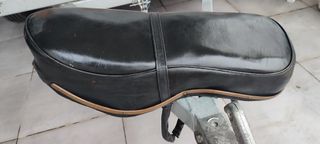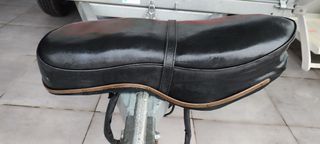 Banco em pele sintética preta para motos BMW clássicas. - Compatível com modelos R25, R26, R27, R60 e outros. - Acabamento com rebordo em metal. - Tira de fixação em pele.