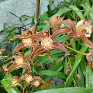 Linda muda de orquídea com pétalas em tons de marrom e listras. - Flores com detalhes em amarelo e manchas vermelhas. - Folhagem verde característica.