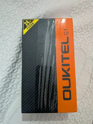 Caixa do telemóvel Oukitel G1 com 256GB de armazenamento. - Design moderno com acabamento em preto e detalhes em laranja.