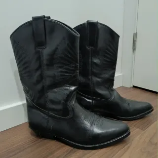 Botas estilo cowboy em preto. - Design clássico com detalhes bordados. - Cano alto. - Material sintético brilhante.
