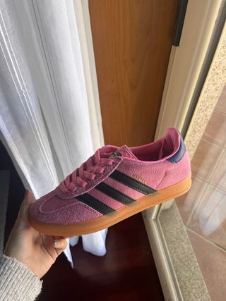 Sapatilhas Adidas Gazelle em camurça rosa com detalhes em azul escuro e sola de borracha. - Design clássico Gazelle. - Três riscas icónicas da Adidas. - Sola em borracha crepe. Artigo ainda com caixa. Atenção: calça, preferencialmente, para um tamanho 37/37.5