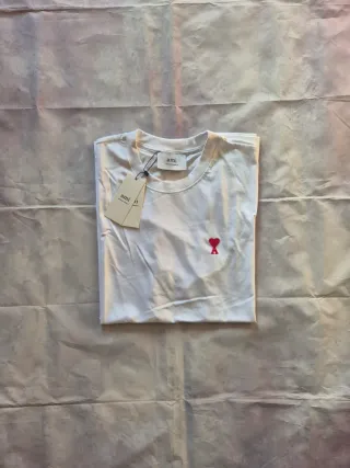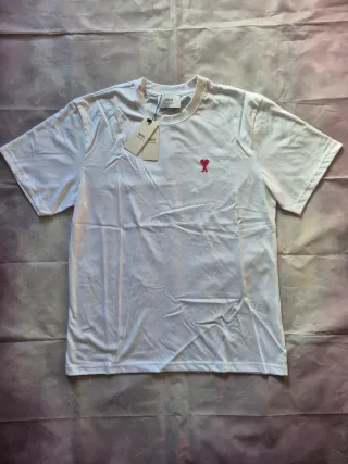 T-shirt da AMI Paris em branco, com o icónico coração vermelho bordado no peito. - Gola redonda. - Manga curta. - Tecido 100% algodão.