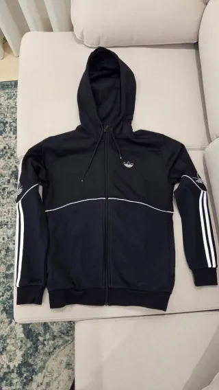 Casaco com capuz da Adidas Originals em preto tamanho XS mas representa um S. Apresenta um design moderno com detalhes contrastantes nas mangas e no peito. - Logo Adidas Originals bordado. - Fecho completo frontal. - Mangas com as icónicas 3 riscas. - Detalhe de linha branca a dividir as secções do casaco.