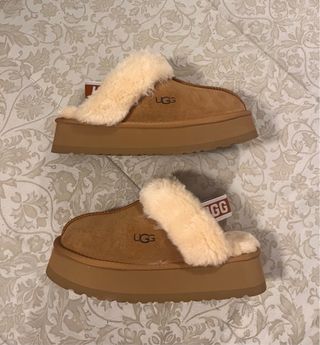 Mule da UGG em camurça com forro de pelo. - Design mule. - Detalhe de pelo macio. - Sola plataforma. Atenção: calça o correspondente a um tamanho 38