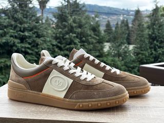 Tênis Valentino Garavani Upvillage Low-Top em camurça e couro. - Detalhes em camurça marrom. - Faixa lateral em couro off-white com logo em relevo. - Cadarços brancos. - Solado de borracha com tachas. - Acabamento em couro marrom na parte traseira.