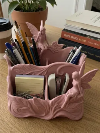 Precioso organizador de escritorio con diseño de hadas y motivos naturales. Ideal para darle un toque mágico y único a tu zona de trabajo o tocador. Detalles: Diseño muy detallado con figuras de hadas y hojas. Uso: Perfecto para bolígrafos, notas (post-it), clips o incluso para pinceles de maquillaje. Color: Rosa pastel mate (acabado sedoso). Estado: Nuevo, fabricado con materiales de alta calidad (PLA) con gran detalle. Regalo ideal: Un detalle original para amantes de la fantasía y la papelería bonita. Hago envíos rápidos por Wallapop. ¡Cualquier duda, pregúntame!
