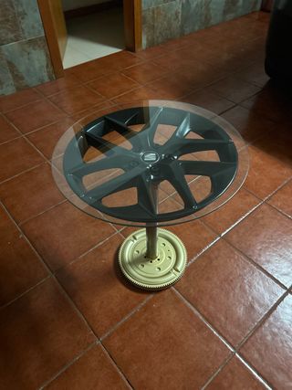Mesa de centro única com design industrial. - Tampo em vidro. - Base em metal com aro de jante. - Peça de declaração para qualquer espaço.