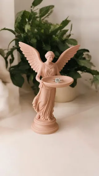 Este encantador expositor en forma de ángel es perfecto para organizar tus anillos. - Calidad: Fabricado con impresión 3D de alta precisión, con un acabado suave para no rayar tus joyas. - Figura de ángel con alas extendidas. - Bandeja para colocar las joyas. 📦 Hago envíos rápidos y muy protegidos por Wallapop Envíos (Portugal -> España/Italia). 💌 ¿Tienes dudas? ¡Escríbeme!