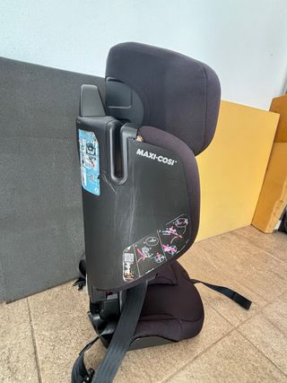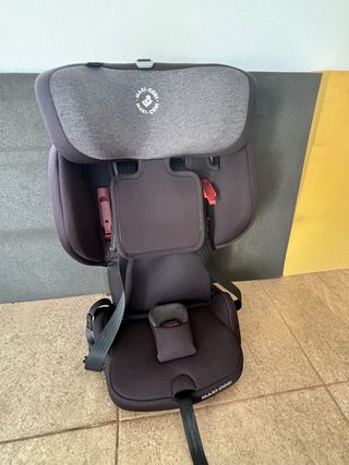 Cadeira auto da marca Maxi Cosi, em tons de cinza e preto. - Apoio de cabeça ajustável. - Cinto de segurança de 5 pontos. - Tecido macio e confortável. - Dobrável