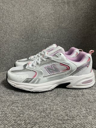 Sapatilhas New Balance com um design moderno e confortável. - Combinação de cores branco e rosa. - Detalhes em prata.