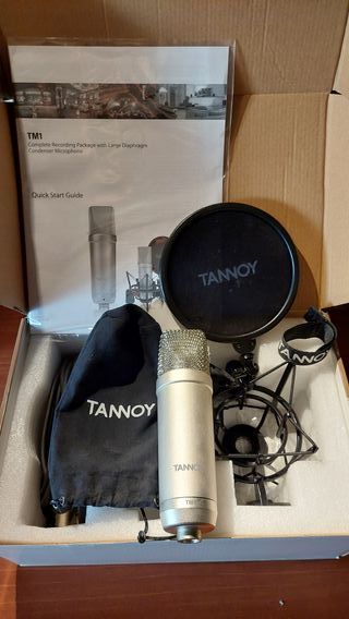 Kit de gravação completo com microfone condensador de diafragma largo Tannoy TM1. Utilizado apenas uma vez em casa. • Característica direcional: cardioide • Requer +48 V de alimentação fantasma • Faixa de frequência: 20 - 20.000 Hz • Peso: 354 g • Inclui um suporte antichoque com proteção pop integrada e um cabo de microfone XLR