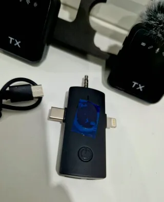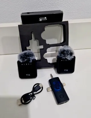 Conjunto de microfones sem fio com receptor. - Dois microfones com pelúcia. - Receptor com conexões USB-C e Lightning. - Cabo de carregamento USB. - Embalagem original.
