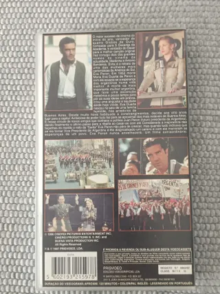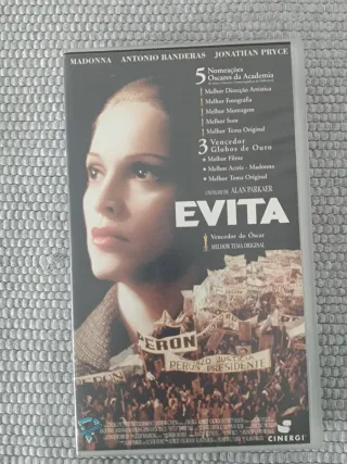 Filme Evita em VHS, estrelado por Madonna. - Vencedor de 3 Globos de Ouro, incluindo Melhor Filme e Melhor Atriz para Madonna. - Recebeu 5 nomeações aos Óscares da Academia, incluindo Melhor Tema Original. - Inclui Melhor Tema Original como um dos prémios vencidos.