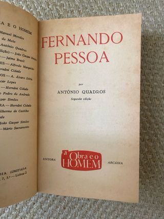 Fernando Pessoa A Obra e o Homem,livro antigo António Quadros Editora Arcádia Capa Mole Idioma em português 2ª edição 326 pags Livro lido,muito bem estimado para os anos que tem,miolo sem nada rasgado nem riscado mas amarelado,sinais do tempo Veja fotografias e o meus anuncios por favor,tenho vários livros
