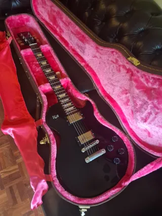 Guitarra eléctrica Gibson Les Paul Studio ebony, modelo Robot de 2008. Foi modificada, tinha o sistema de afinacao automatica que foi substituida por afinadores gibson deluxe (kluson). A parte electronica tambem foi alterada mas mantem os mesmo componentes de origem. Pickups gibson de origem 490r neck, 498t bridge. Acompanha case gator.