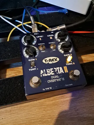 Pedal de guitarra T-Rex Alberta II Dual Overdrive. - Controles de Level 1, Level 2, Gain 1, Gain 2, Tone 1, Tone 2. - Modos Normal y Fat. - Fabricado en Dinamarca.