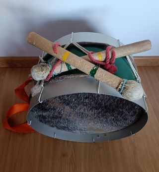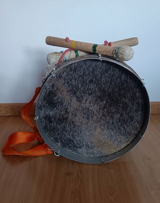 Traditional bass drum in natural leather in green paint handmade by the main maker of traditional bass drums from Lavacolhos, belonging to the Schist villages and with a museum of this musical instrument with two handles approximate measurements of 40 cm in diameter and 24 cm in width and handles in real wood with 33 cm in length I bought it but just for decoration, I'm not a musician and I hardly used it Also ideal for children and women due to its smaller size and weight like NEW an instrument that tells a story that can be used for music but also decoration