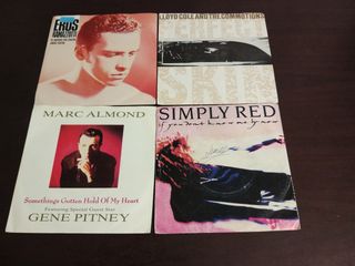 Conjunto de 4 singles de música pop rock, edições portuguesas. - Ekus de Eros Ramazzotti - Perfect de Lloyd Cole and the Commotions - Something's Gotten Hold Of My Heart de Marc Almond com Gene Pitney - If You Don't Know Me By Now de Simply Red