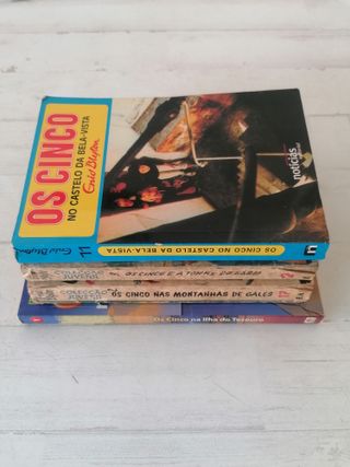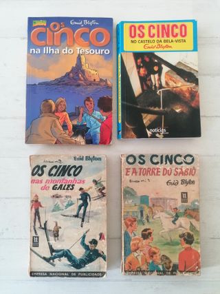 Quatro livros da coleção "Os Cinco": - Os Cinco no Castelo da Bela-Vista - Os Cinco na Ilha do Tesouro - Os Cinco nas Montanhas de Gales - Os Cinco e a Torre do Sábio Caso pretenda um, o preço é 3€. Por favor contacte-me para mais informações. Obrigado!