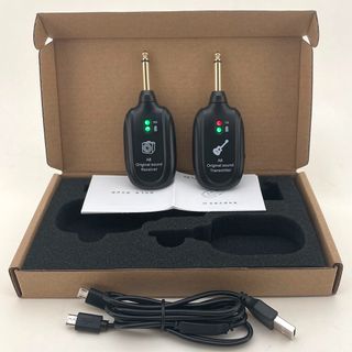 Sistema de transmissão e receção sem fios bluetooth para vários instrumentos musicais electroacústicos (guitarra, baixo, etc). A transmissão do som é feita na frequência original Uhf 730mHz, tem anti-interface e atraso ultra-curto possibilitando uma excelente qualidade de som. Suporta até 4 conjuntos de dispositivos a trabalhar em simultâneo, e o alcance máximo da transmissão é 50 metros. A bateria de lítio embutida é recarregável, e o cabo USB está incluído. Além disso, é simples de usar, de tamanho compacto e leve, Plug and play e fácil de transportar. Inclui: embalagem original, 1 recetor, 1 transmissor, instruções e cabo USB