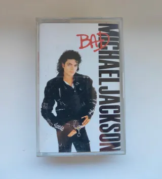 Cassete do álbum Bad de Michael Jackson. - Capa com a imagem do artista. - Título do álbum em destaque.