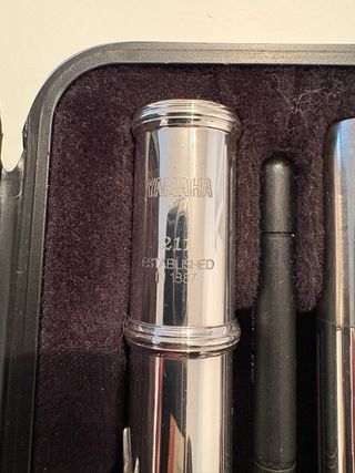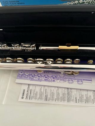 Flauta transversal Yamaha da série Plutus, bocal em banho de ouro. Foi usada durante muito pouco tempo, mas ficou guardada alguns anos. Alguns sinais no metal de ter estado guardada. O mecanismo a funcionar como nova. - Flauta transversal Yamaha - Estojo de transporte - Manual do proprietário - Caixa original