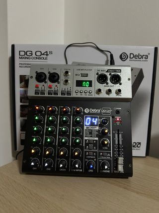 Interface de áudio profissional Debra DG04S. - Console de mixagem com 4 canais. - Entrada USB para MP3 player. - Resolução de áudio HI-RES 24bit/192k. - USB C para gravação ou transmissão ao vivo - 99 efeitos para voz - Bluetooth 5.0 Nova nunca utilizada