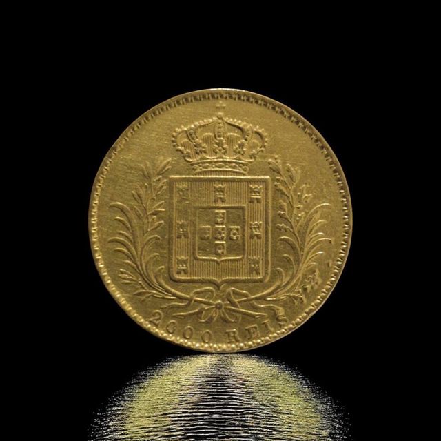 Detalhes do produto2000 Reis de Portugal de 1864. Moeda de Ouro 22K (toque 917‰) com 3,55g.