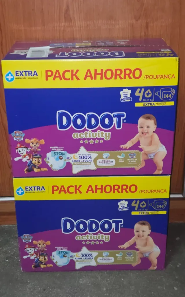 Pack de 288 pañales Dodot Activity, talla 4+. - 2 cajas de 144 pañales cada una. - Talla 4+ (10-15 kg). - Absorción Extra.