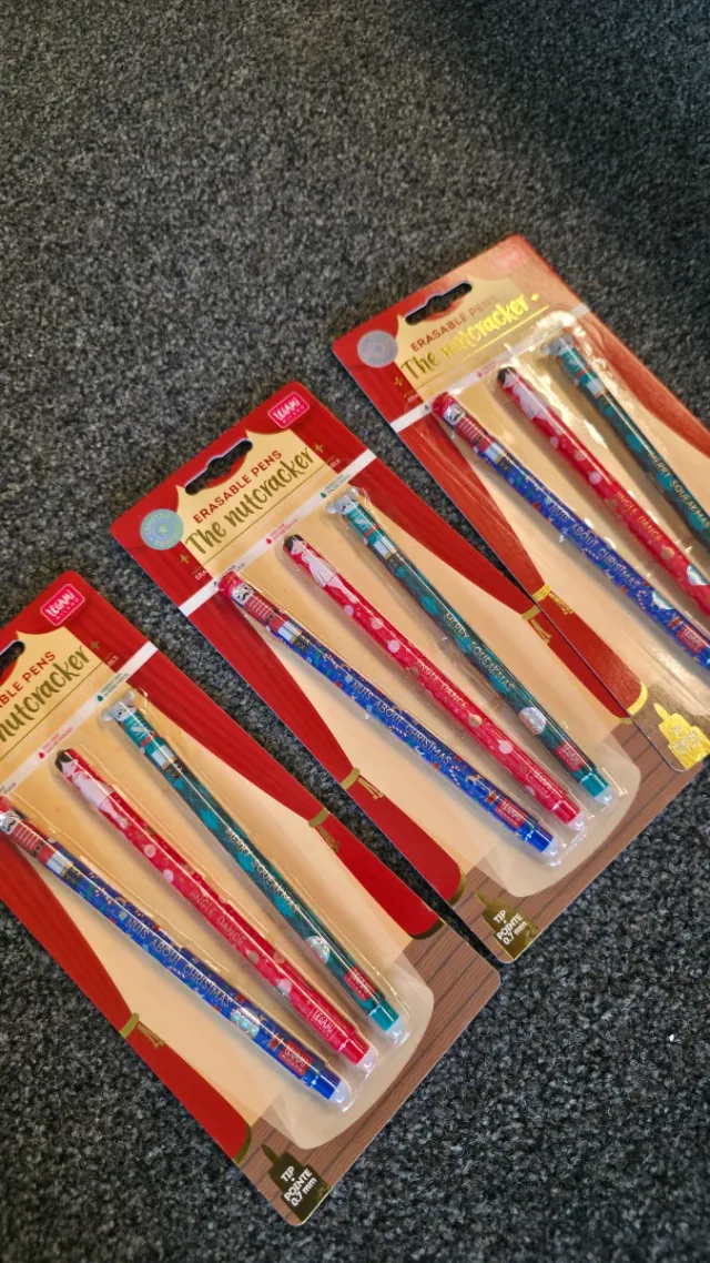 Detalhes do produtoConjuntos de canetas apagáveis da Legami com tema O Quebra-Nozes para o Natal de 2025. São 3 conjuntos no total.