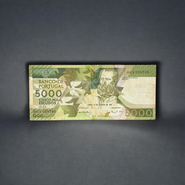 Nota de 5000 escudos de Portugal. Chapa 2A, datada de 19 de Outubro de 1989. Nota num excelente estado de conservação. Envio em 24h.