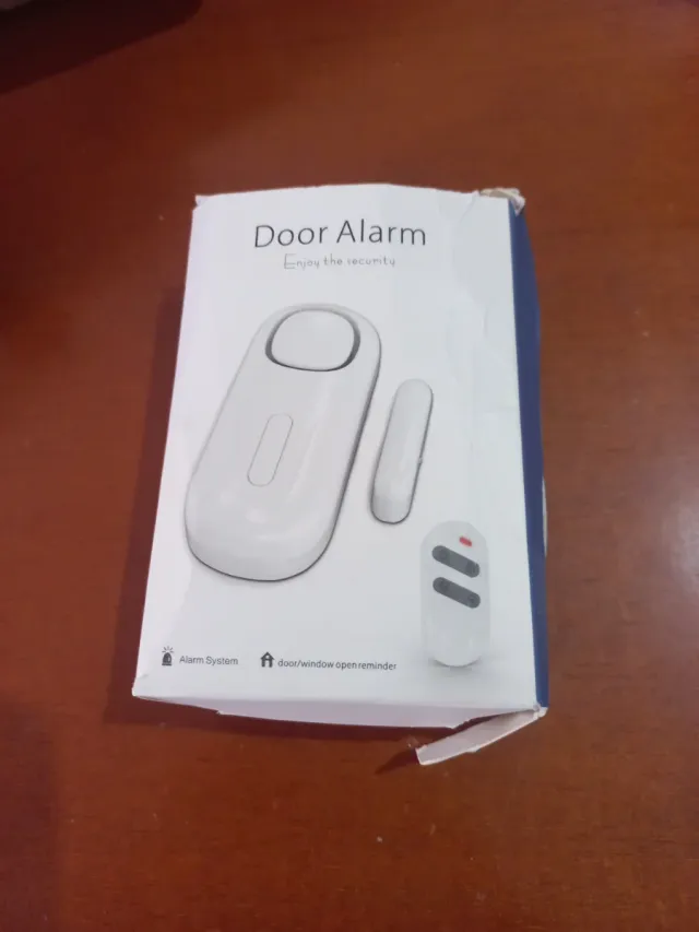 Sistema de alarme para portas e janelas, com um design discreto e moderno. - Inclui unidade principal e sensor. - Controlo remoto para armar e desarmar.