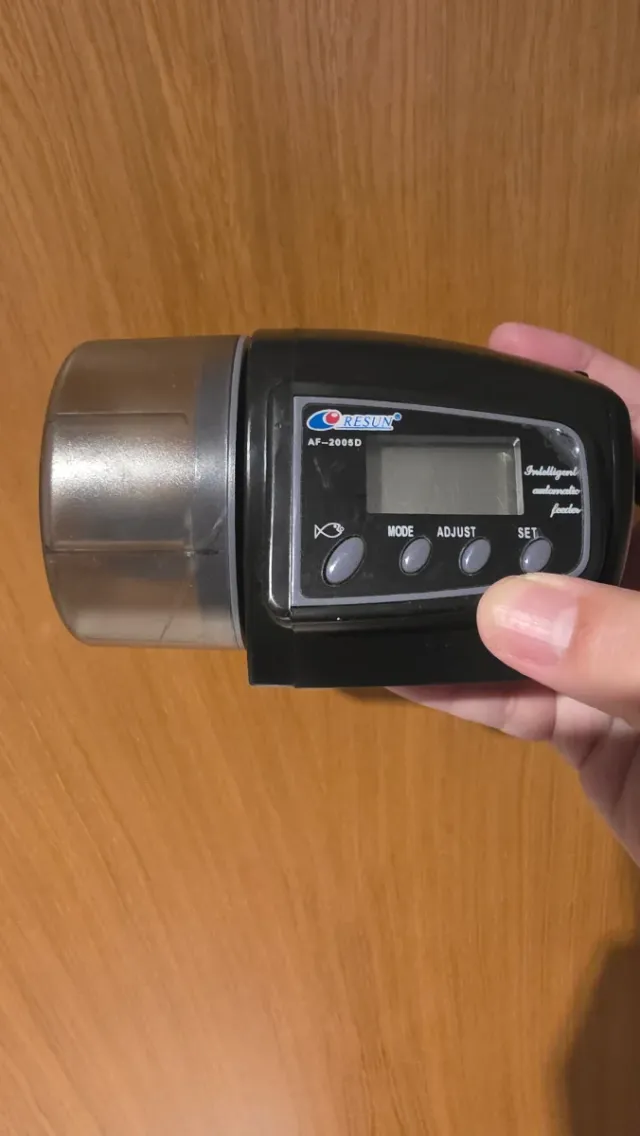 Detalhes do produtoAlimentador automático para aquário da marca Resun, modelo AF-2005D. Possui um ecrã digital e botões de controlo.