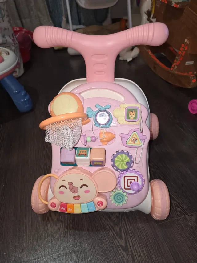 Andador e mesa de atividades para bébé. Tem um argola partida, visível nas fotos