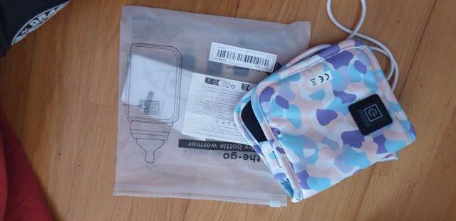 Aquecedor de mamadeira portátil com design moderno e prático. - Estampa camuflada em tons pastel. - Botão de ligar/desligar com indicador LED. - Certificação CE.