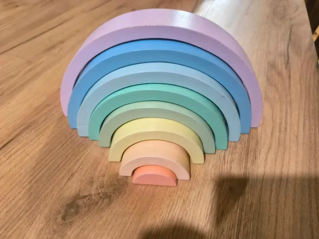 Conjunto de peças em madeira em forma de arco-íris, com cores pastel suaves. - Peças em madeira. - Cores pastel variadas. - Design de arco-íris.