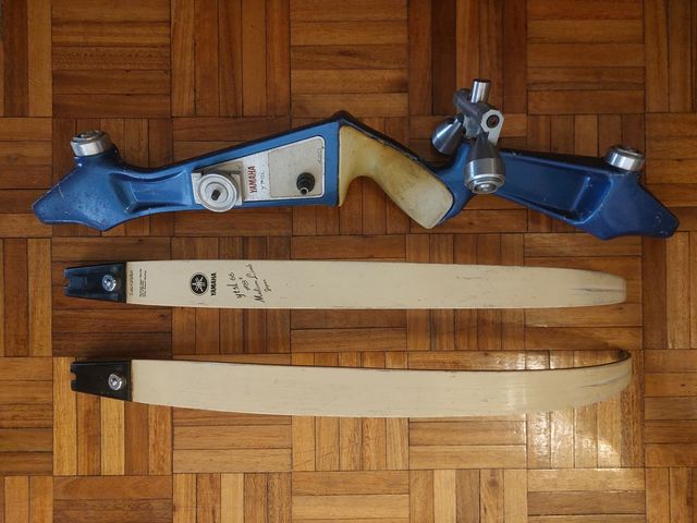Detalhes do produtoCorpo arco recurvo YAMAHA YT-SL vintage, palahetas YAMAHA de 38 lbs em bom estado de funcionamento. Medidas do produto