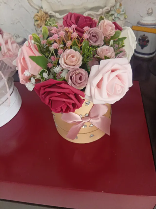 Arranjo de flores artificiais em tons de rosa e vermelho, com detalhes em pedrarias e laço. - Flores em espuma. - Vaso redondo decorado.