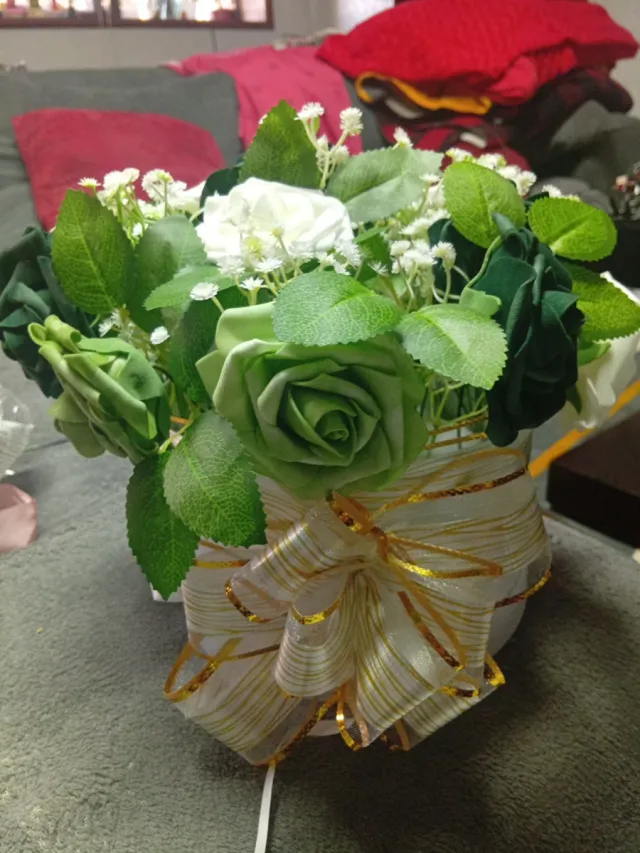 Detalhes do produtoArranjo de flores artificiais em tons de verde e branco, com um laço dourado.