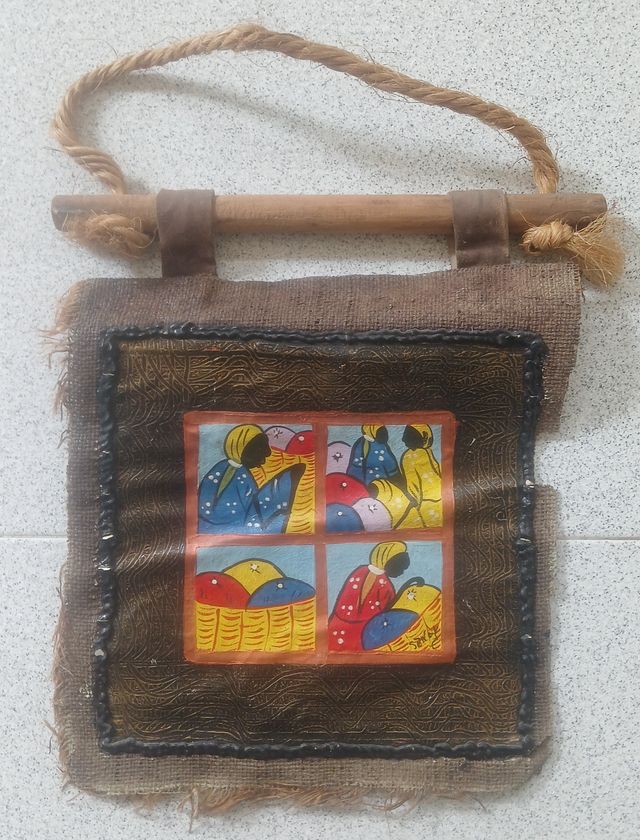 A pintura está emoldurada por um tecido de juta rústico e suspensa por uma estrutura de madeira e corda.
