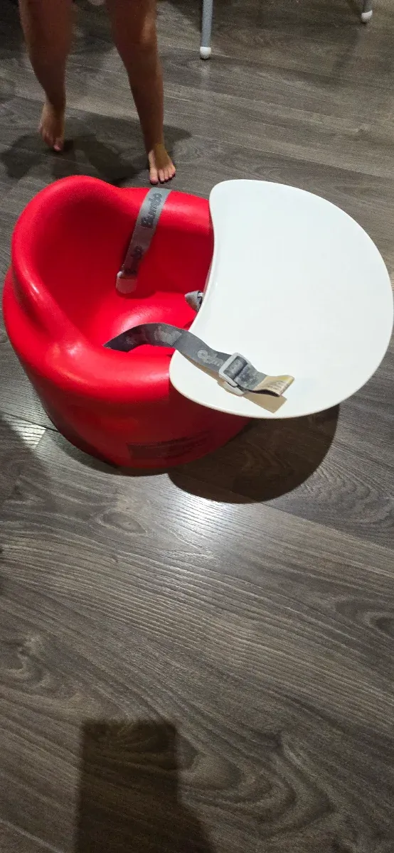 Assento de apoio para bebés em vermelho. - Cinto de segurança com fecho. - Bandeja branca acoplável.