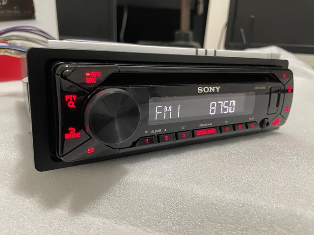 Auto rádio Sony CX-G1300U. - Botão PTY/Q. - Botão MODE. - Botão EQ. - Botão SRC/OFF. - Ecrã digital. - Botões de navegação.
