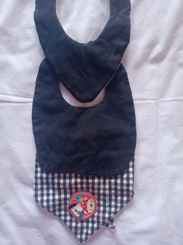 Tres baberos en tonos negros, dos de ellos reversibles y en muy buen estado.