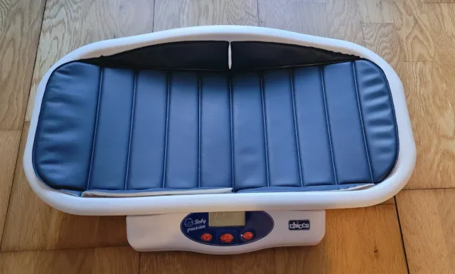 Balança digital Chicco para pesar bebés. - Design branco e azul. - Ecrã digital para leitura do peso. - Botões de controlo.