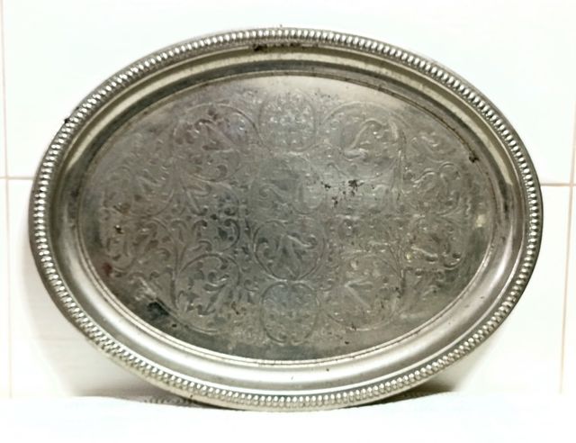 Detalhes do produtoBandeja ovalizada em metal prateado com inscrições, antiga, em relativas boas condições.