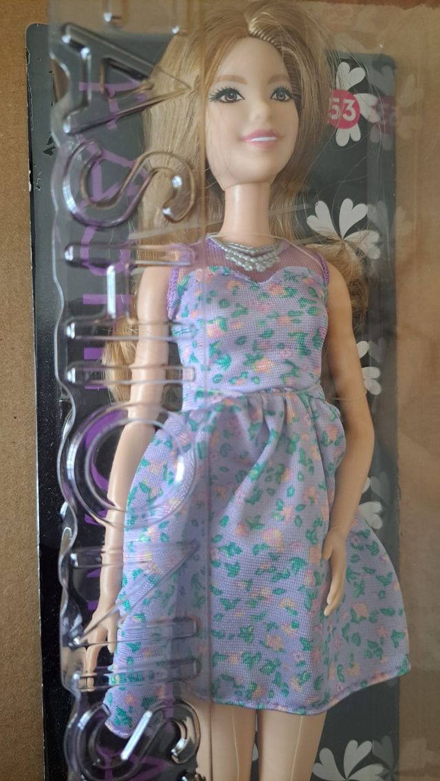 Barbie Fashionista 53 com cabelo loiro. - Vestido lilás com estampa floral. - Colar prateado.