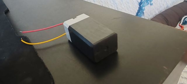 Bateria recarregável para uso em solda. Possui um design compacto e é fácil de conectar. - Cor: Preto e cinza. - Fios de conexão: Vermelho e amarelo.